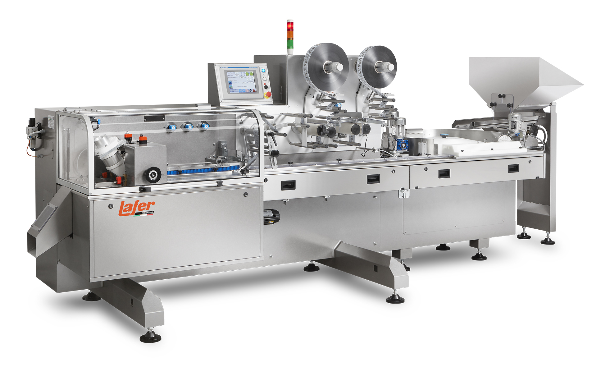 Envasadora horizontal de alta velocidad específicamente diseñada para el envasado de caramelos y productos de confitería duros en formato flowpack. Permite confeccionar multipacks, tiras de productos pre-cortadas, envasado de chupa-chups y piruletas, inserciones de promocionales (cromos, figuras...)
